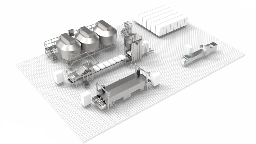 Bestehend aus Abfülleinrichtung AFE mit integrierter Vorentmolkung und Mechanisierungssystem zur kontrollierten Formgebung, Entmolkung und späteren Kühlung in der Form